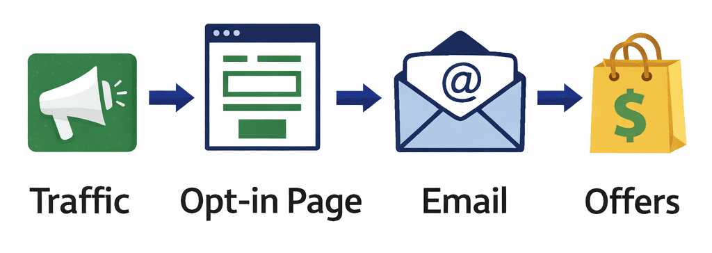 👉 Traffic → Opt-in Page → Email → Offers